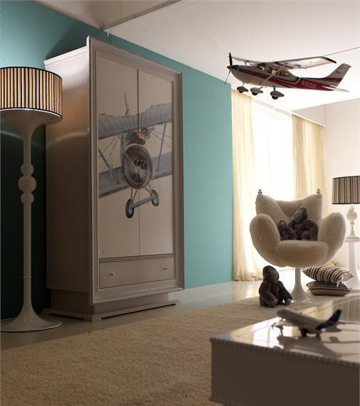 Headsets for children from the Italian manufacturer AltaModa. The model is intended for a boy. Includes single bed, bedside tables, wardrobe and chest of drawers. Frames made of solid wood. Finish - gloss or Matt lacquer. Headsets are made in a modern style.