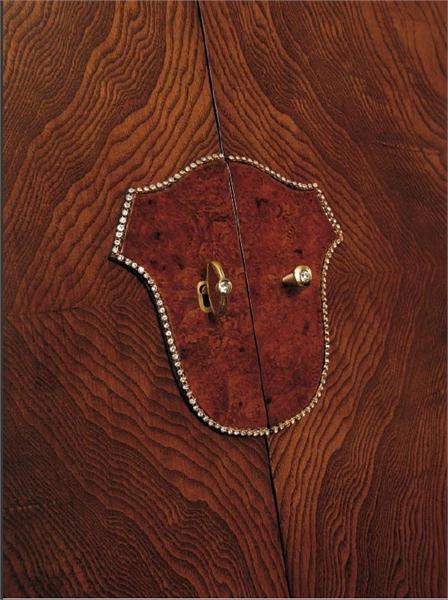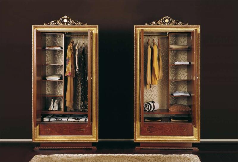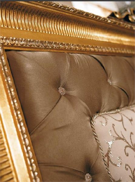 Headsets for bedrooms from Italian manufacturer AltaModa. Includes double bed with high headboard, bedside tables and wardrobe. Frames models made from solid wood. The surface is treated with glossy varnish. Upholstery - textiles. Accessories metal. Decoration is a decorative hand-carved gilded. Set is made in the style of glamour.