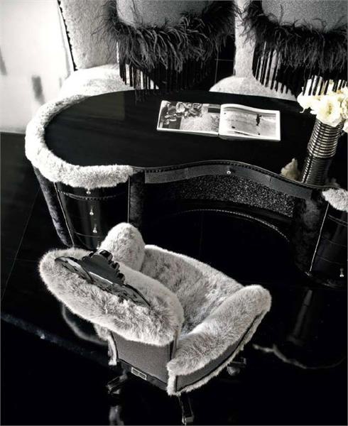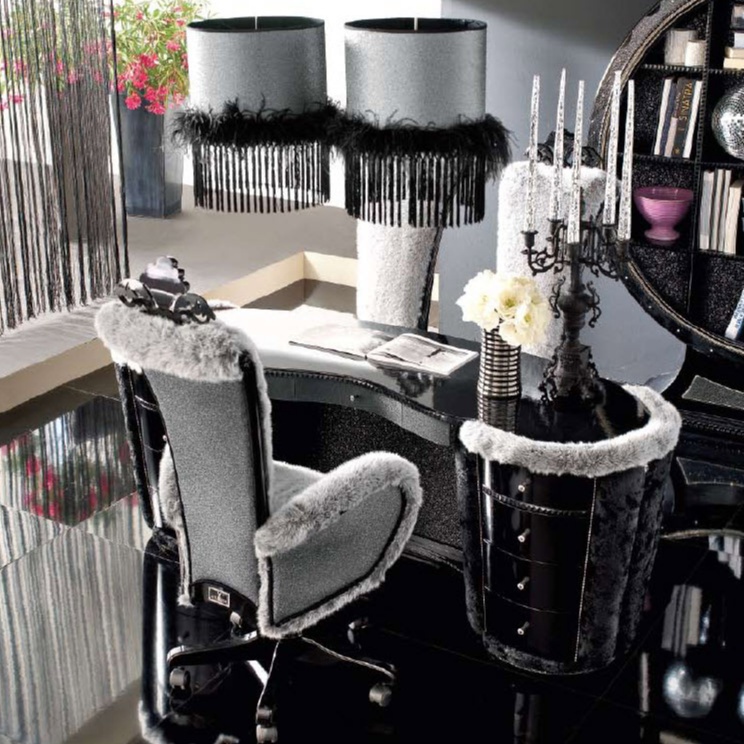 Tiffany Desk wrighting table from the Italian manufacturer AltaModa. Model with a rounded top and massive legs. Upholstery textile to choose from a range of firms. Drawers complemented with metal handles. The table is manufactured in contemporary style.