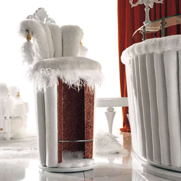 Tiffany bar chair stool from the Italian manufacturer AltaModa. The model attracts attention with its originality and unusual design. The frame is made from solid wood. Finish - white lacquer. Upholstery textile from the company portfolio. Additional comfort is provided by a metal footrest.