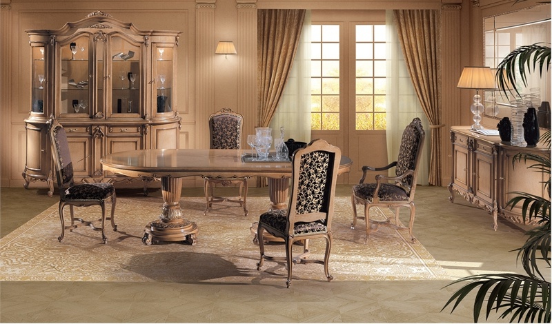 Set for the dining room from Italian manufacturer Angelo Cappellini. Includes dining table with oval tabletop, showcase and chairs with or without armrests. Frames models made of solid wood. Finish - gloss or Matt lacquer. Shutters and shelves made of transparent glass. Swing doors can be locked. Upholstery textile. Colours from the collection company. Decoration is the decorative carving handmade.