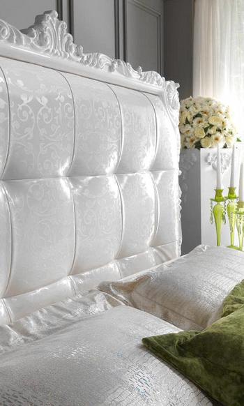 Italian furniture for bedroom production of Antonelli Moravio solid wood. Consists of double bed with high headboard, bedside tables, chest with drawers and chair. Material - solid wood. The surface is treated with glossy varnish. Upholstery textile. Drawers complemented with metal handles. The model is decorated with carving and stitch-Capito.