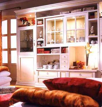 Modular system from Italian manufacturer Antonelli Moravio. The model includes open shelves, deaf and glazed storage units. The frame is made from solid wood. Finish - white lacquer. Decorative metal fittings. The design has built-in backlight.
