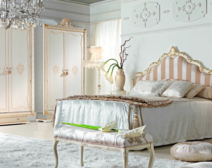 Headsets for bedrooms from Italian manufacturer Antonelli Moravio. Includes double bed, two wardrobes and a bench. Each richly decorated with hand carved. Frames made from solid wood. Finishing varnish from the company portfolio. Upholstery - textiles. Swing doors are locked. Set made in a classic style.