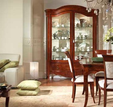 Showcase from Italian manufacturer Antonelli Moravio. Model with a rounded facade and low legs. Material - solid wood. The surface is covered with varnish. Sash and sides are made of transparent glass. At the bottom there are drawers. Handles are metal. Swing doors are locked. The model is notable for elegance and durability.