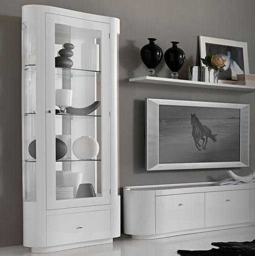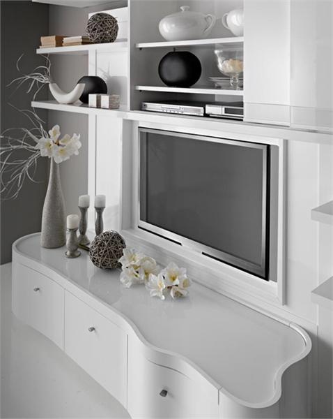 Modular system from Italian manufacturer Antonelli Moravio. The model consists of open shelves, sections with hinged doors, drawers and space for TV. The frame is made from solid wood. The surface is covered with a glossy varnish. Color option - white. The model is a modern design, strength and capacity.