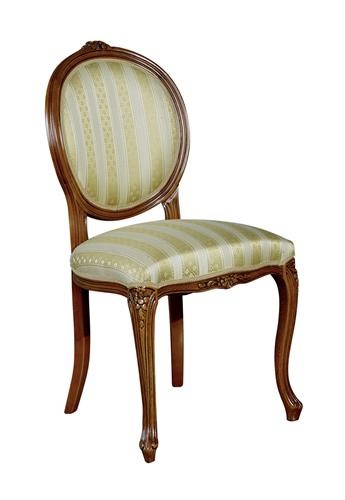 A chair from the Italian manufacturer Arcari. Model on high legs and backrest in the shape of a medallion. The frame is made from solid wood. The varnish finish offered from the company portfolio. Upholstery textile. Offered a version with armrests. The chair is made in a classic style.