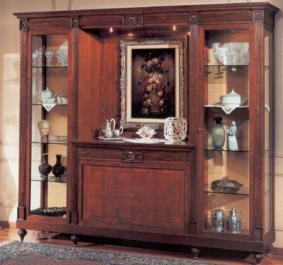 A display Cabinet from the Italian manufacturer Belcor. The frame is made from solid wood. Model with space for storage of utensils, TV and books. Cabinet with built-in lighting. A good choice for a library or living room in classic style. Available color dark. Colours in stock.