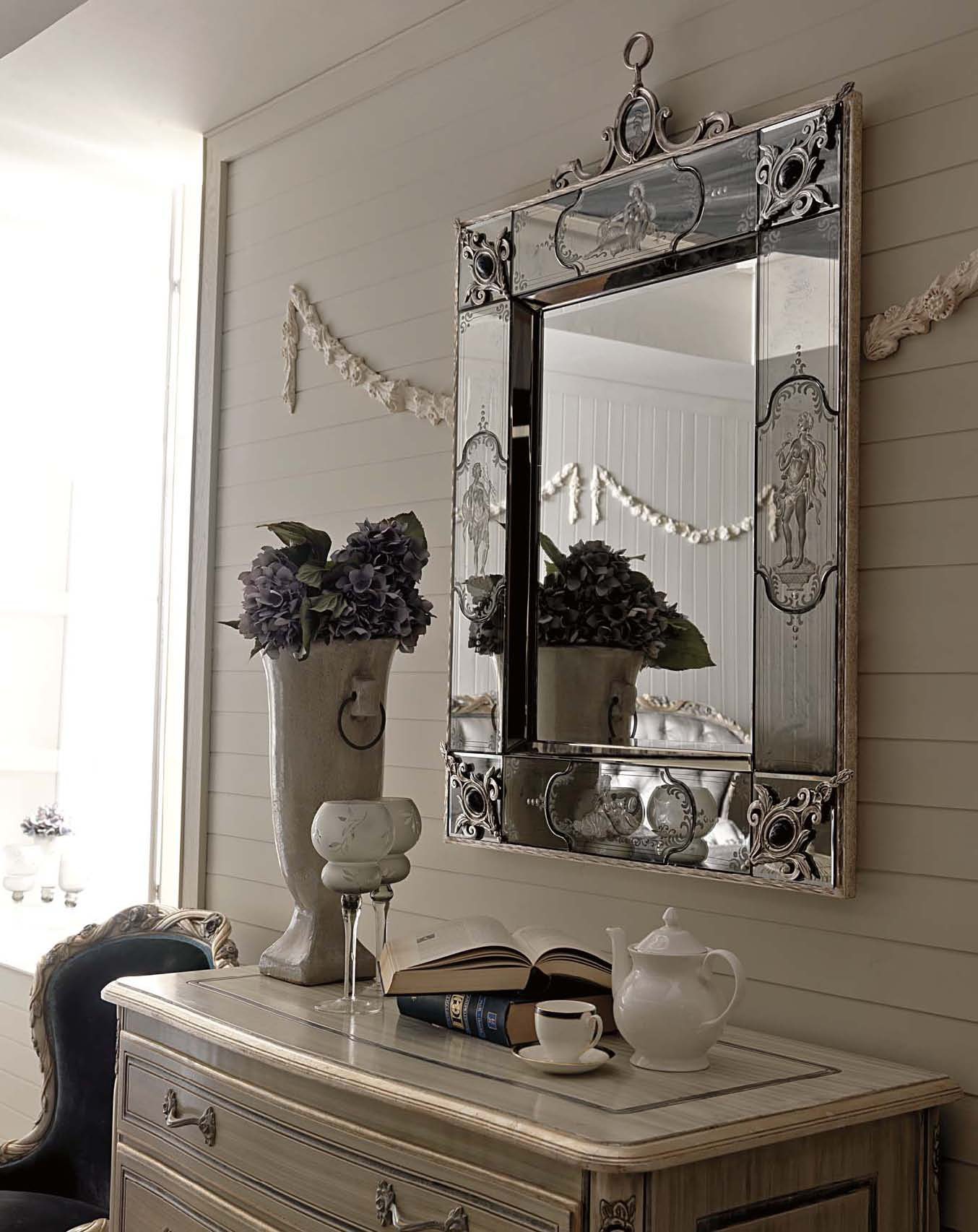 Set for bedroom Ambiente Notte from the Italian manufacturer Savio Firmino. Consists of double bed, bedside bench, chest of drawers, chairs, mirrors and bedside tables. The frame and legs are made of solid wood with a weathered finish. Headboard adorned with decorative carvings and with stitch-Capito. Upholstery textile from the company portfolio. Accessories metal. Set made in a classic style.