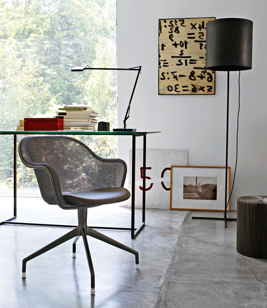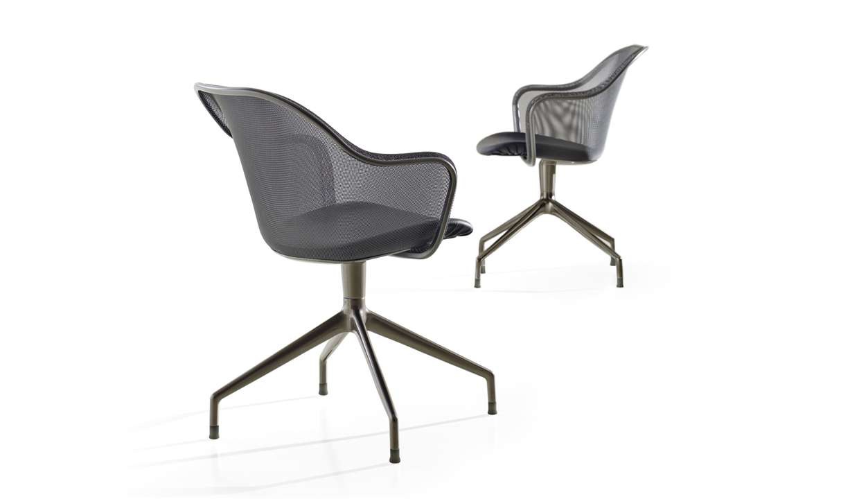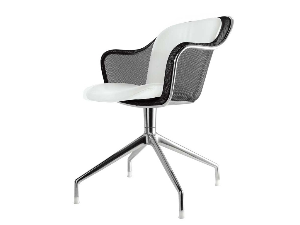 Iuta chair from the Italian manufacturer B&B Italia. Model with a rounded back which fades into the armrests. The frame and base are made of metal. Finish to be selected from the range of the company. Legs are complemented by the wheels. Seat and back plastic. In addition, it is proposed a soft cushion in leather or textile upholstery.