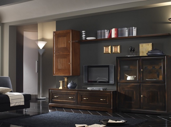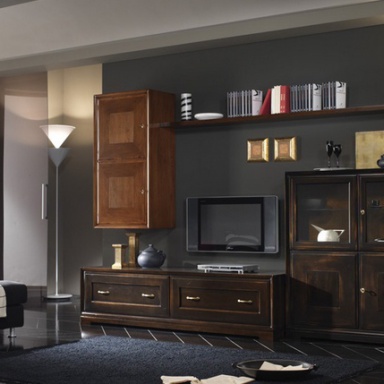 Modular system made of solid wood, from the Italian manufacturer at the stilema stand. The frame is made from solid wood. Finishing varnish from the company portfolio. Fittings - metal. Doors made of wood or solid glass. Have a place for a panel TV. The model is made in classic style.