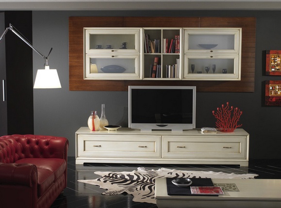 Modular system from Italian manufacturer at the stilema stand. Includes mounted and floor lockers. Frame made of wood. Offered lacquer finish in white. Sash glazed. There is a place for TV.