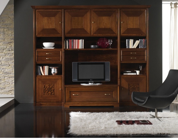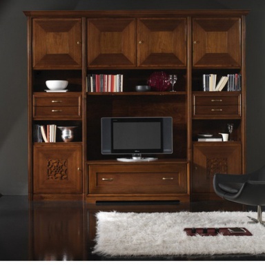 Modular system made of solid wood, from the Italian manufacturer at the stilema stand. The frame is made from solid wood. Finish - lacquer and inlaid wood. The system consists of open, closed sections and space for TV. Fittings - metal.