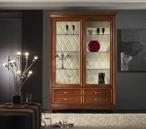 A display Cabinet from the Italian manufacturer at the stilema stand. The model is made of solid wood. Fronts and internal shelves are made of glass. Back panel upholstered in leather white color. The Cabinet contains drawers. The model is made in classic style.