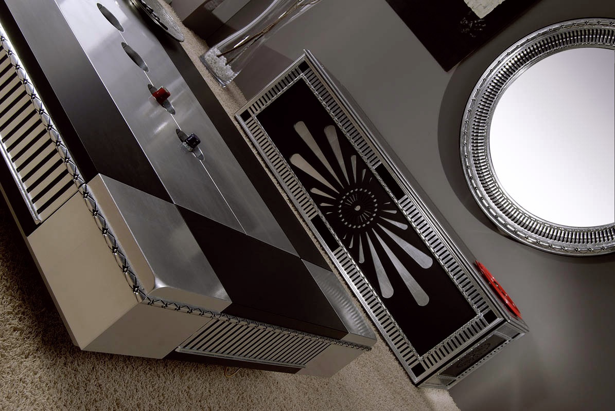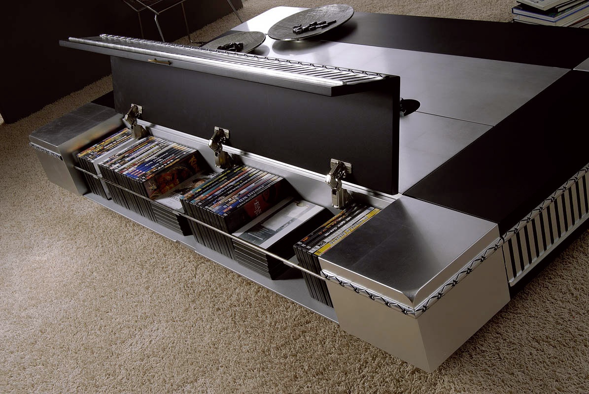 170 Ciaika coffee table from the Italian manufacturer Vismara. The model is made of solid wood and metal. There is a section for storage with a hinged lid. The top is rectangular. Finish options: lacquer/silver plated/gold foil. Colours in stock.