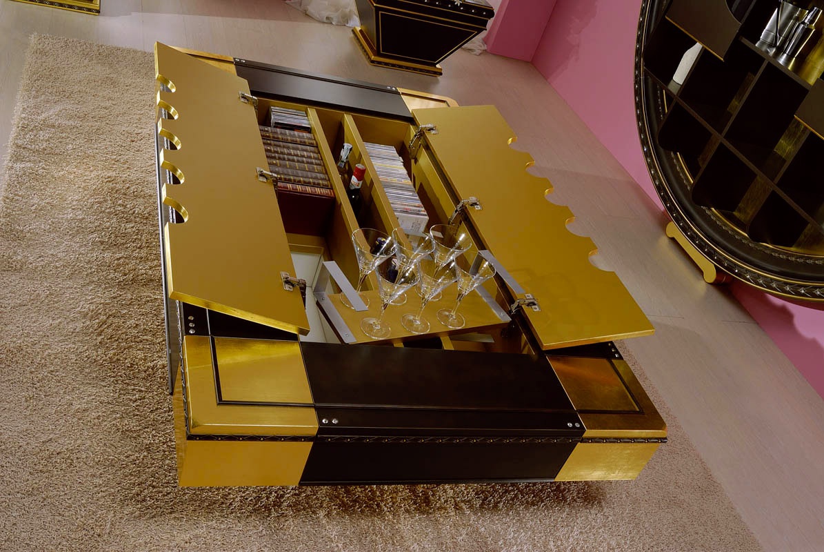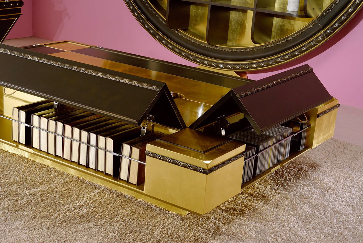 170 Ciaika coffee table from the Italian manufacturer Vismara. Rectangular low table/kvadratnogo. Equipped with compartments to accommodate CD / DVD. The model is available in different color combinations the choice of the customer, including finished off in gold leaf / silver. A great choice for interior design in art Deco style