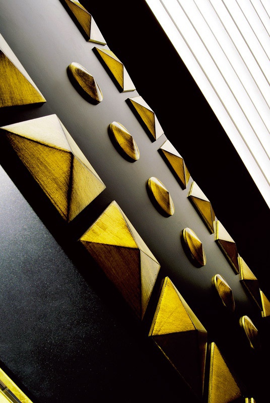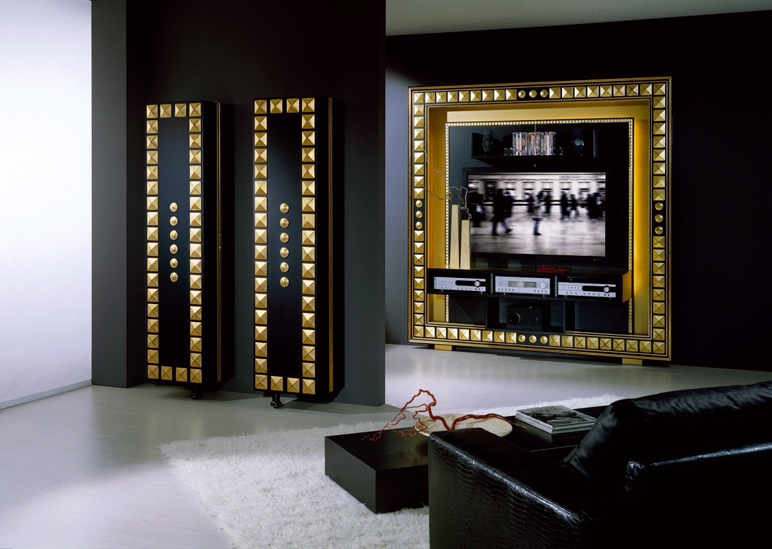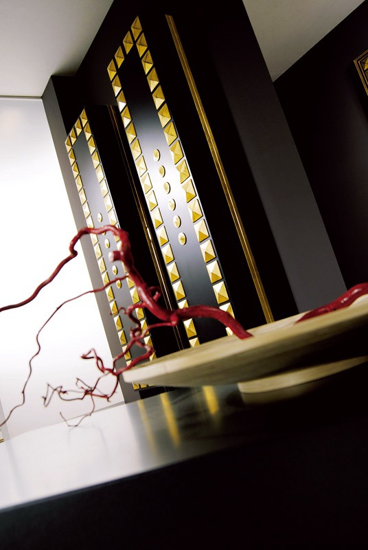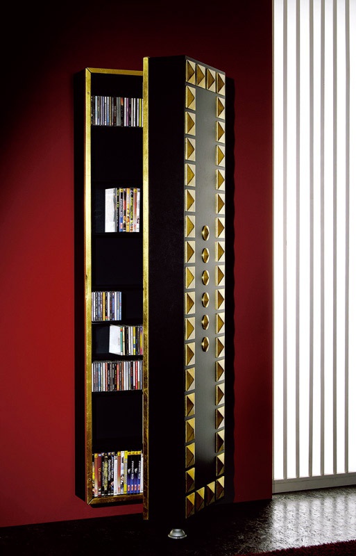 Scrigno stand from Italian manufacturer Vismara. The body is made of solid wood, the surface is treated with varnish from the range of the campaign. The legs are metal. Hinged wing opens to the end, on the inner side with shelves. The facade is decorated with round elements and decor in the form of "pyramids." The elements - gold leaf/silver. Colors: Golden, black.