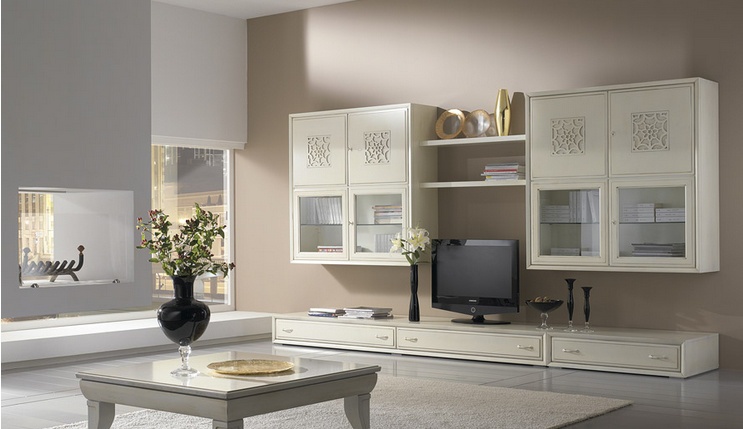 Modular system made of solid wood, from the Italian manufacturer at the stilema stand. The frame is made from solid wood. Finish - lacquer and inlay on the facades in the shape of flowers. The model assumes that the section for books and a TV. The system will perfectly complement an eclectic living room.