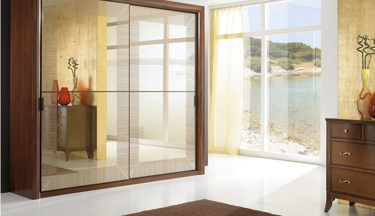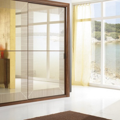 Wardrobe from the Italian manufacturer at the stilema stand. The frame is made from solid wood. Finish - wood veneer. Doors - sliding, mirrored with geometricheskii ornament. The Cabinet is designed in modern style.