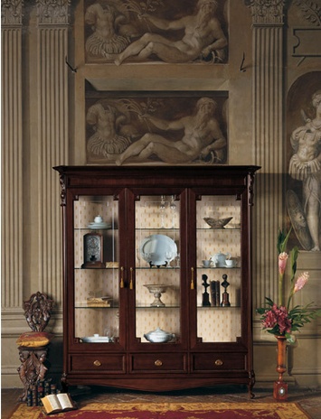 A display Cabinet from the Italian manufacturer at the stilema stand. The model is made of solid wood. Fronts and internal shelves are made of glass. The model is decorated with carved decoration. The model is made in classic style.