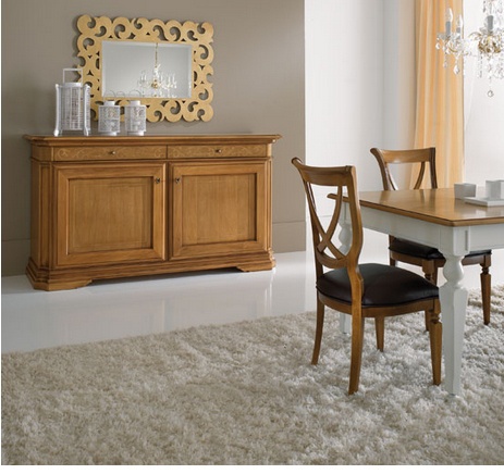 The buffet from the Italian manufacturer at the stilema stand. The model is made of wood. The facade is decorated with inlay. Finish made in the color of natural wood. The model is made in classic style.