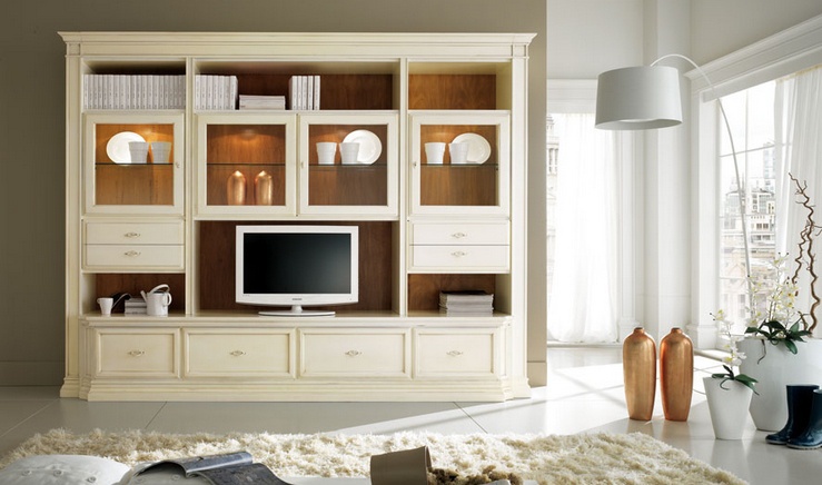 Modular system from Italian manufacturer at the stilema stand. Model on a frame of solid wood. Offered lacquer finish in white. Shutters and shelves made of transparent glass. Accessories metal. Built in illumination.