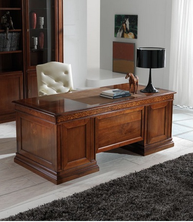 Desk from the Italian manufacturer at the stilema stand. The frame is made from solid wood. Accessories drawers made of metal. Top supported by two massive legs of which consist of boxes. The table is made in classic style.