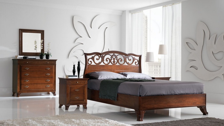 Headsets for bedrooms from Italian manufacturer at the stilema stand. Includes double bed, two bedside tables and a chest of drawers. Skeleton models made of solid wood. The bed is decorated with carved headboard. Metal fittings are offered. Set made in a classic style.