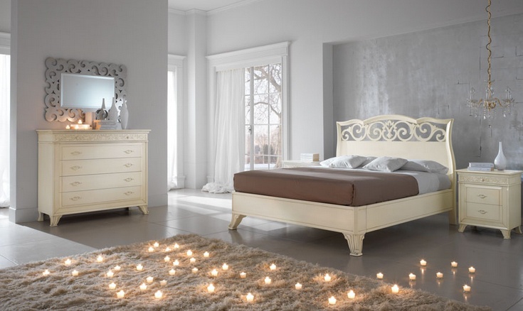 Headsets for bedrooms from Italian manufacturer at the stilema stand. Includes double bed, two bedside tables and a chest of drawers. Skeleton models made of solid wood. The bed is decorated with carved headboard. Metal fittings are offered. The trim is made of ivory. Set made in a classic style.