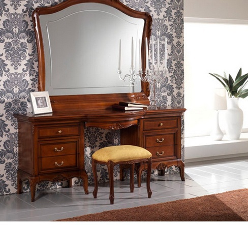 Dressing table from the Italian manufacturer at the stilema stand. The model consists of drawers. The frame is made from solid wood. Finish offers brown. The table is complemented by a large mirror. The model is made in classic style.