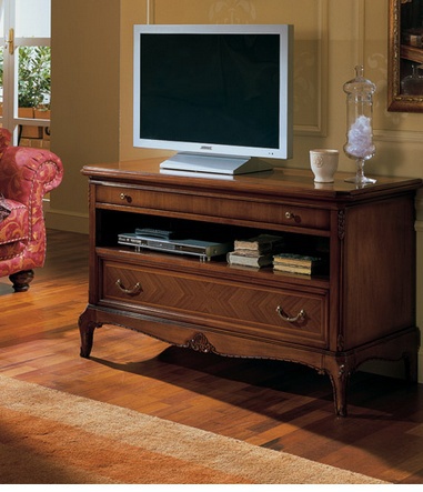 Cabinet for TV from the Italian manufacturer at the stilema stand. The model consists of drawers and roomy shelves. The frame is made from solid wood. Finish offers brown. The model is made in classic style.