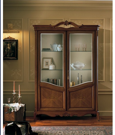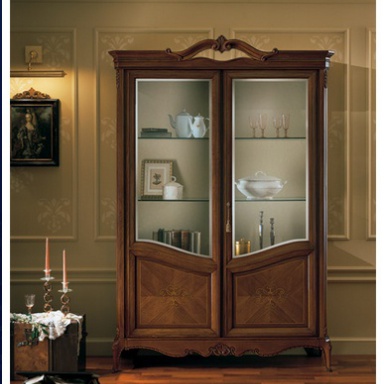 Showcase, from the Italian manufacturer at the stilema stand. The frame is made of wood. Finishing varnish from the company portfolio. The facade is decorated with carved and inlaid elementami. The doors and shelves glass. Fittings - metal. Showcase is made in the classic style.