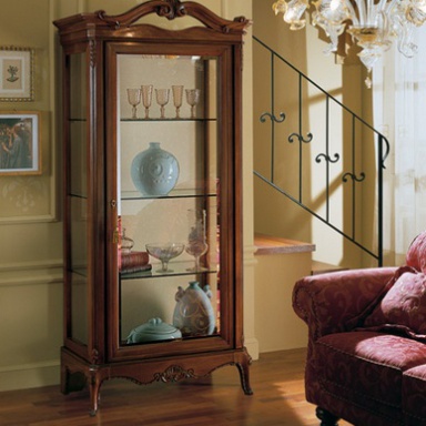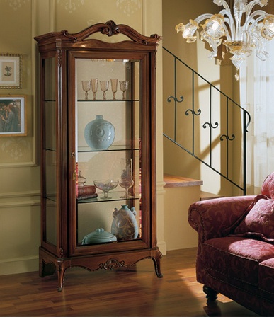 Showcase, from the Italian manufacturer at the stilema stand. The frame is made of wood. Finishing varnish from the range okmpanii and carved elements. Decor dopolnyayut Cabriole the legs. Door and shelves made of solid glass. The style is classic.