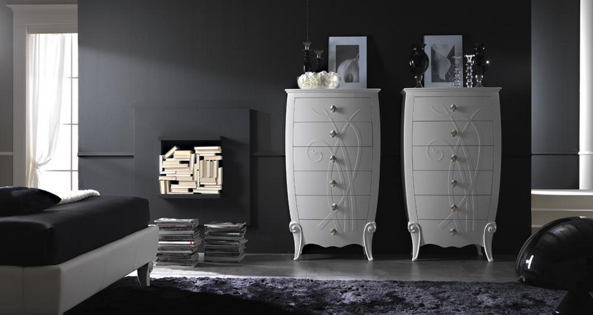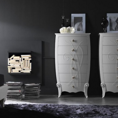 High chest of drawers from the Italian manufacturer at the stilema stand. The model consists of several drawers. The frame is made from solid wood. The finish is offered in white. The facade is decorated with inlay. Legs with decorative insert.