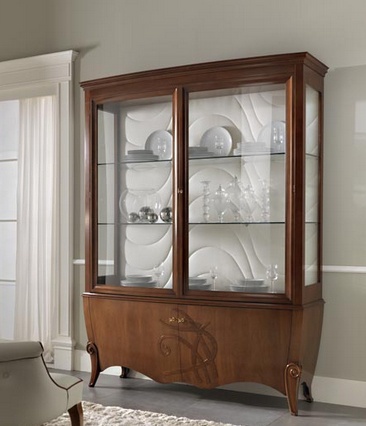 Showcase, from the Italian manufacturer at the stilema stand. The model is made of solid wood. Fronts and internal shelves are made of glass. The model is decorated with carved base and facade. Two-leaf model is made in a modern style.