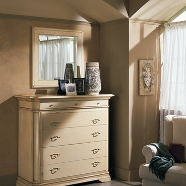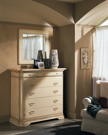A chest of drawers from the Italian manufacturer at the stilema stand. The model consists of four wide drawers with metal hardware. The frame is made from solid wood. Finish - lacquer ivory and age. The model is made in classic style.