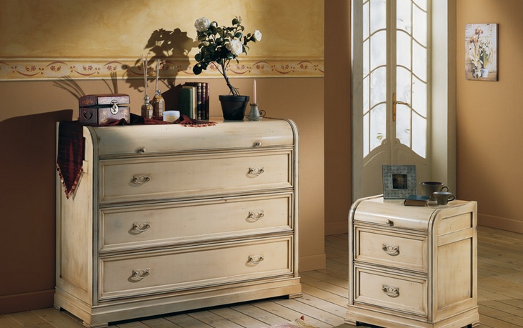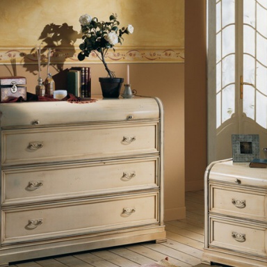 A chest of drawers from the Italian manufacturer at the stilema stand. The frame is made from solid wood. Finish lacquer ivory and age. The model consists of three wide drawers and one section with folding dirceu. Fittings - metal. The model is made in classic style.