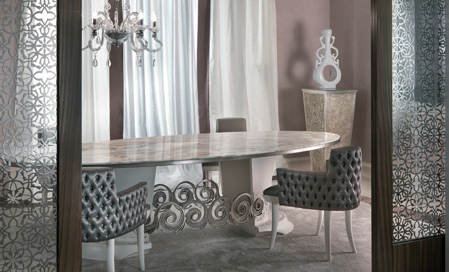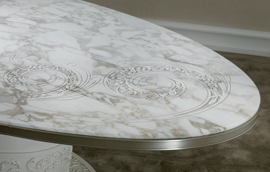 Dining table from Saraya Elledue Italian manufacturer.Oval table with countertop marble. The elements presented openwork carving on wood and metal. Product color - white. The incredible lightness of the model will be displayed in the dining room for any meal turn into festive special event. The table included in the dining set.