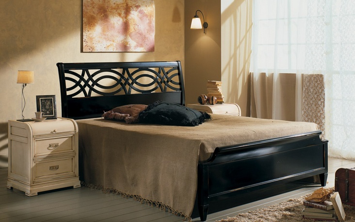 Headsets for bedrooms from Italian manufacturer at the stilema stand. Includes double bed, two bedside tables. Skeleton models made of solid wood. The bed is decorated with carved headboard. Metal fittings are offered. The trim is made of ivory and black. Set made in a classic style.