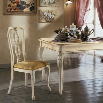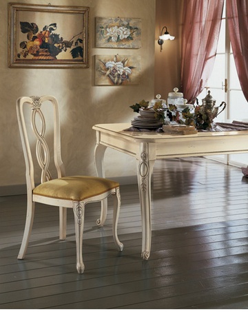 Chair in upholstery, from the Italian manufacturer at the stilema stand. The frame is made from solid wood. Etelka - Lac from the company portfolio. upholstery - textiles. The back is decorated with decorative elements. The model is made in classic style.