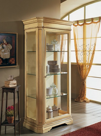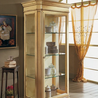 Showcase, from the Italian manufacturer at the stilema stand. The frame is made of wood. Finish - antique lacquer, carved elements. Colors - ivory. The model will perfectly complement the modern interior of the dining room.