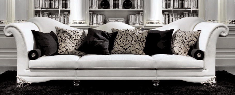 Sofa from Italian manufacturer Elledue. The frame is made from solid wood, legs - metal, filler - foam, upholstery - textiles. The back is wavy. Elegant model living room in classic style. The design of complementary decorative pillows and cushions. Product color white, black.