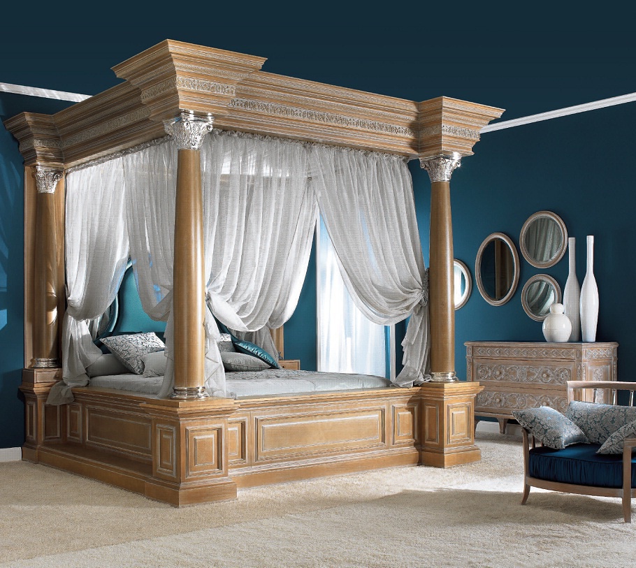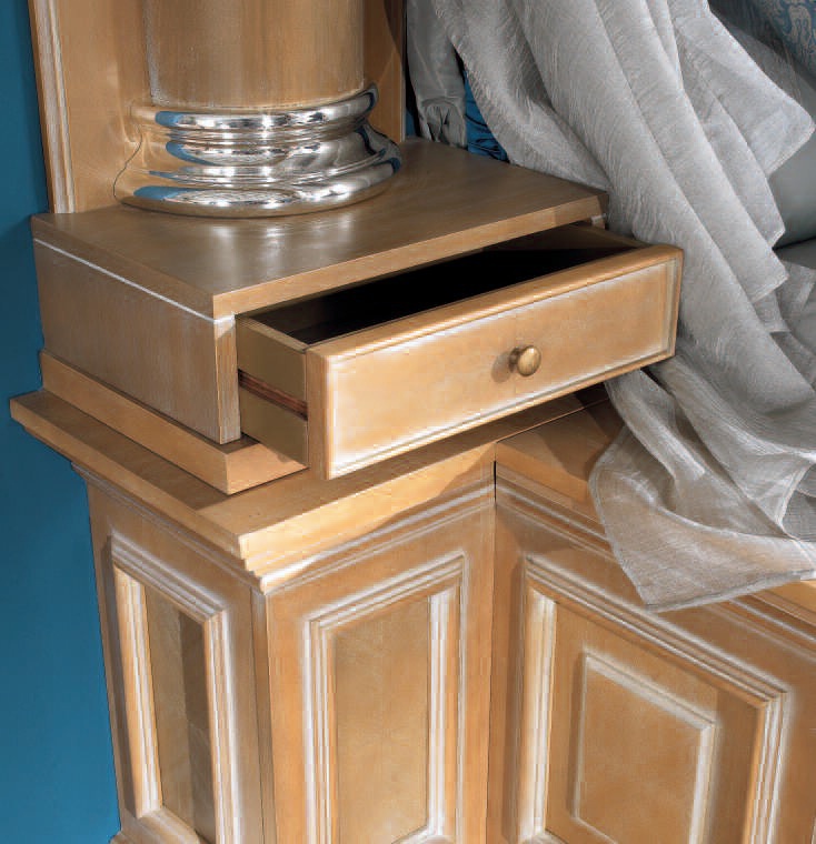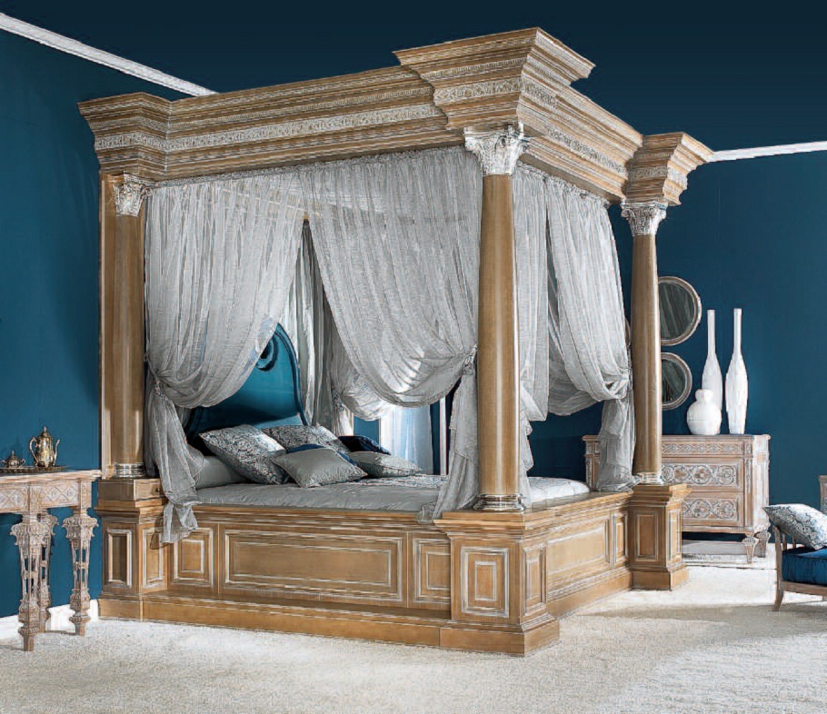 The bed is from Italian manufacturer Elledue. The frame is made from solid wood, the surface is treated with varnish from the company portfolio. Double model with a canopy, on the podium, with high headboard and soft. Decor elements - silver plated. The design is complemented with four columns and decorative pillows. Colours in stock.