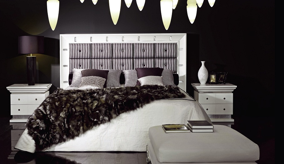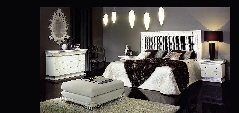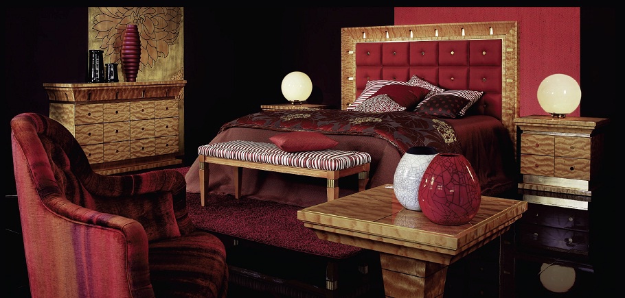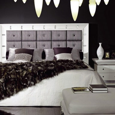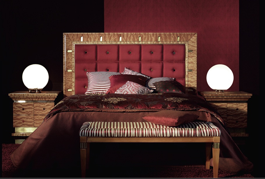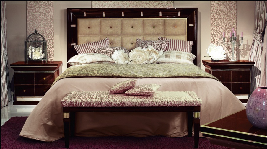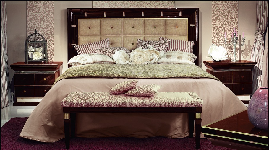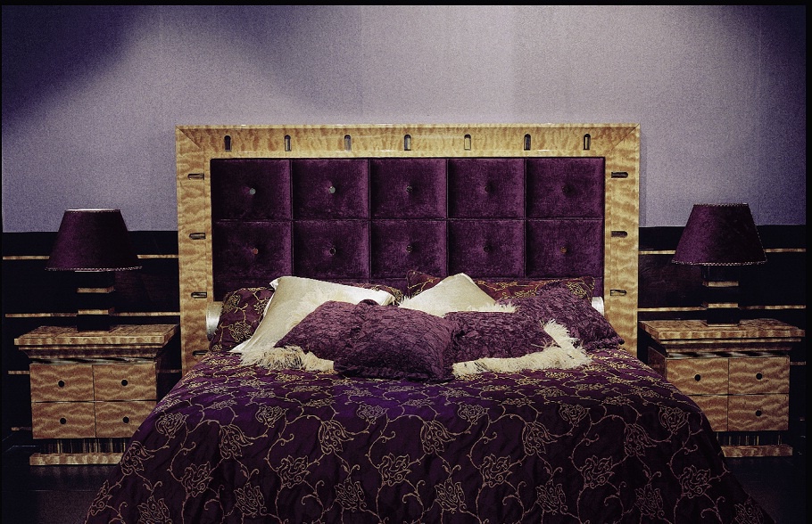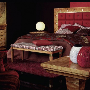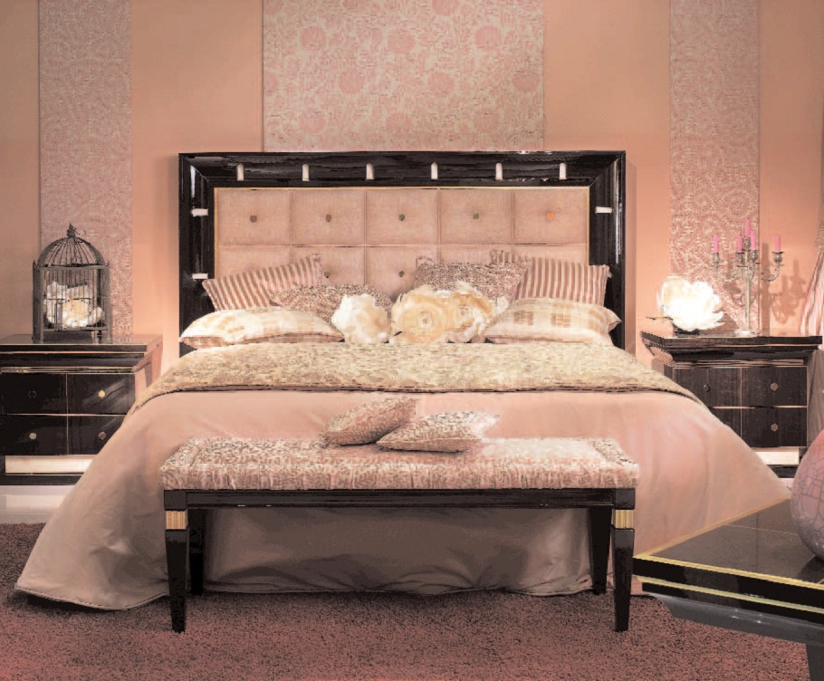 Set for bedroom Orpheo from the Italian manufacturer Elledue. Set includes double bed with high headboard, bedside tables, chest of drawers and a pouf table. The furniture is made of solid wood and metal, the surface is treated with varnish from the company portfolio. Textiles and finish - from the range of the company. Set in a classic art Deco style is the perfect choice for bedrooms.