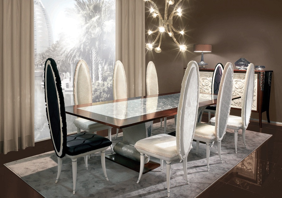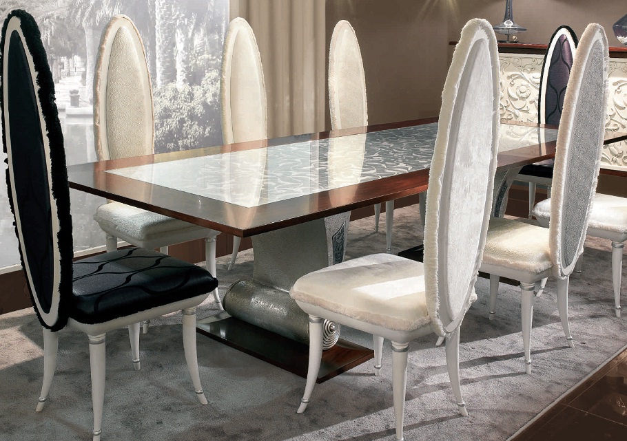 Dining table from Saraya Elledue Italian manufacturer. The frame is made from solid wood, the top wooden tabletop covered with paintings and glass, the support figure, covered with silver leaf. Color is back in stock. A great model for the dining room in glamorous and art Deco styles. The product enters the dining room set from the same collection.