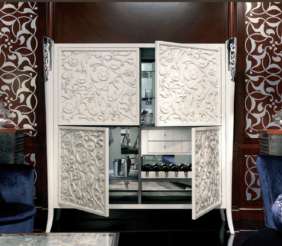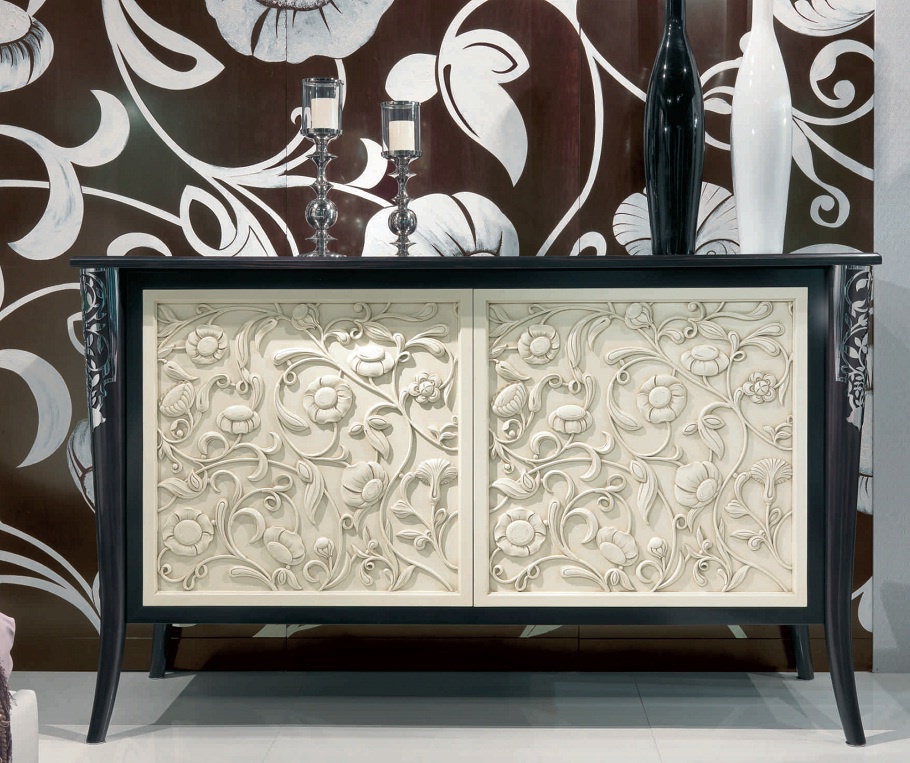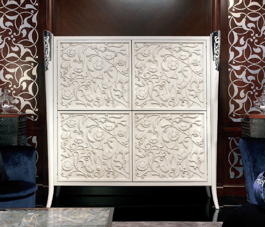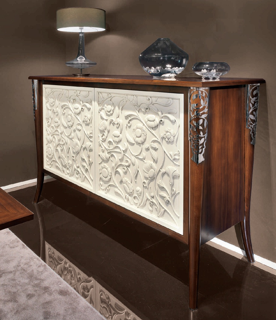 Dresser from Saraya Elledue Italian manufacturer. The frame is made from solid wood, varnished, color from manufacturer's catalogue. The model is presented in 3 versions: two-door and four-door chest of drawers and dresser-bar four-door. Element of the decor is the wood carving on the wings as well as metallic decorative parts on the legs. A great model for the dining room in a classical and art Deco styles. The product enters the dining room set from the same collection.