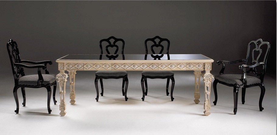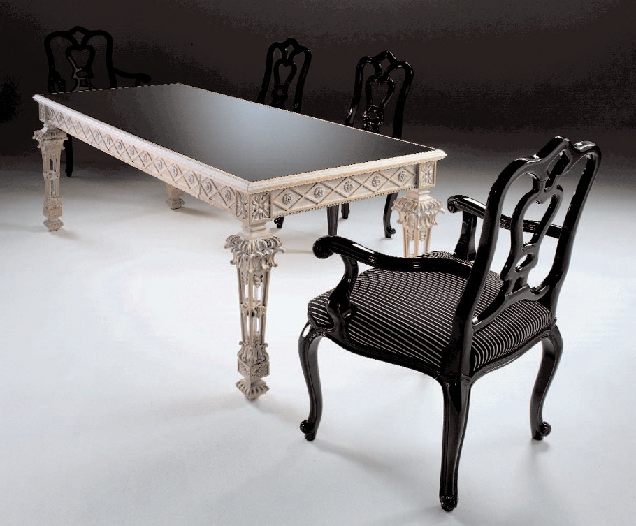 Dining room set for Opera from the Italian manufacturer Elledue. Set includes rectangular dining table shape and chairs with armrests. The furniture is made of solid wood, the surface is treated with varnish from the range of the campaign. Chairs with upholstery. The table is decorated with inlay. Colours in stock.