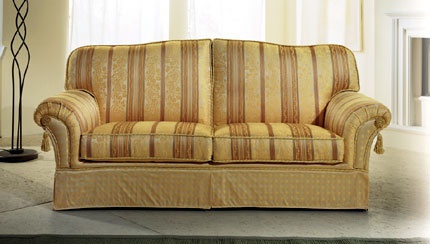Two-seater sofa from Italian manufacturer Essepi. The model with square back and padded arms. Upholstery textile. The base is hidden by a decorative skirt. Filler-polyurethane foam. Distinguished elegance and practicality.