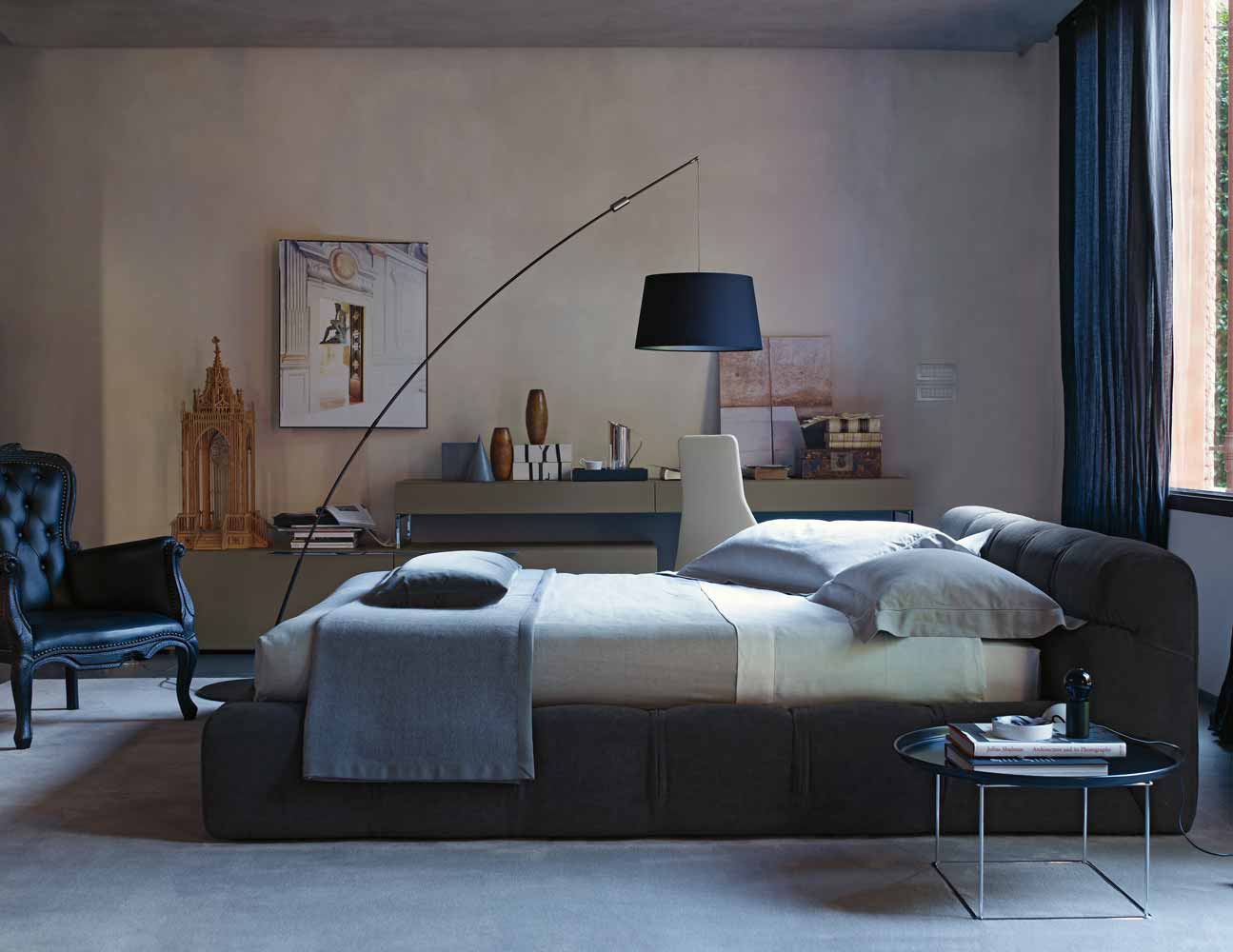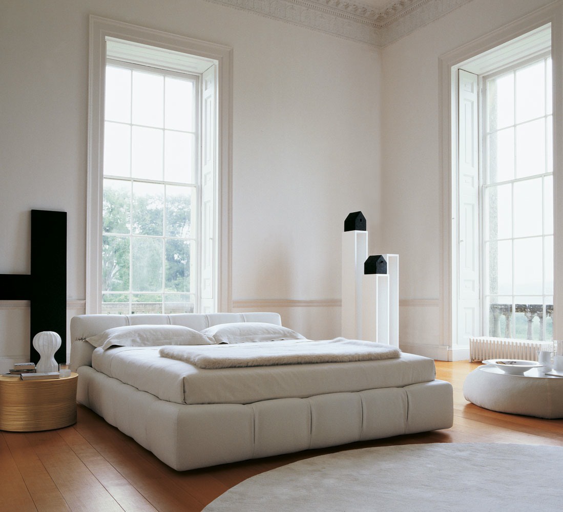 Double bed TUFTY-BED from Italian manufacturer B & B Italia. Model with low upholstered headboard. The upholstery is available in leather or textile. Color option to choose from a collection company. The filler is not deformable polyurethane foam. The model for modern interiors.