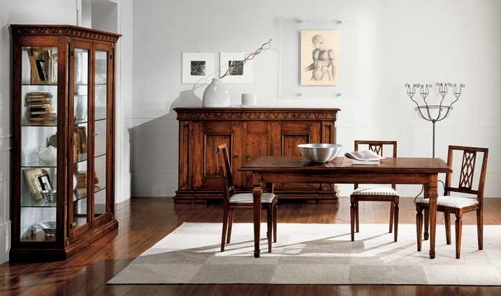 Antique dining room Day from Italian manufacturer of BAMAX. Consists of dining table, showcase, chairs and dresser. Material - solid wood. The veneer finish is offered from the collection of the company. Chairs upholstered in fabric. The sash and glass shelves. Each model is decorated decorative hand carved.